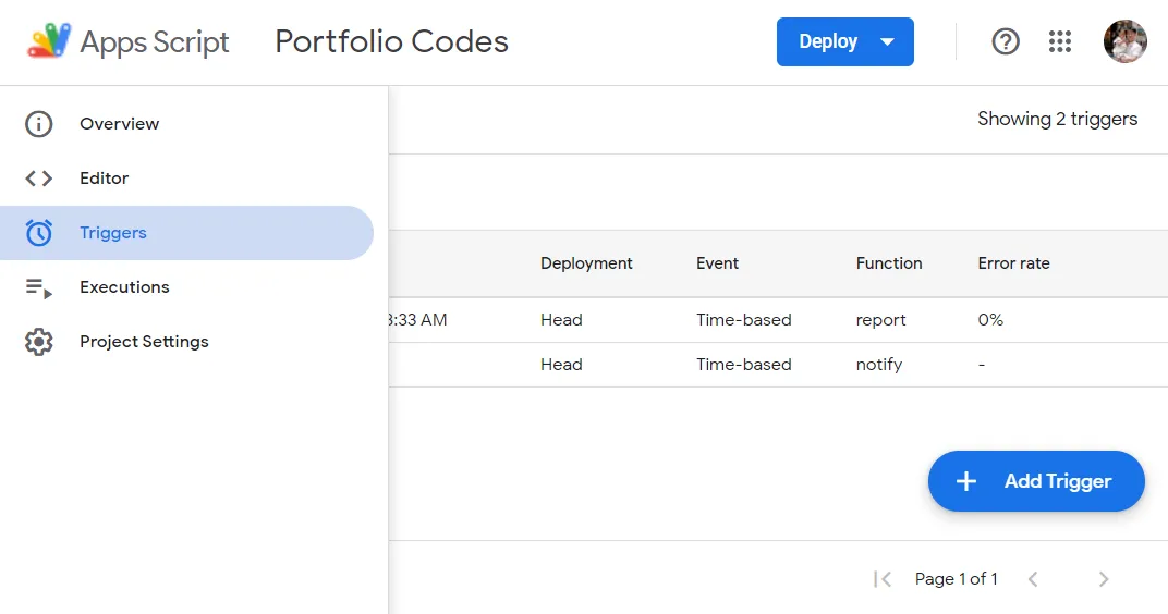 이메일 보내는 함수를 Google 서버에서 정기적으로 실행하도록 Trigger를 등록할 차례입니다. 화면의 좌측에 세로로 나열된 메뉴에서 시계 아이콘으로 그려진 [Triggers] 를 누르고, 우측 하단의 [Add Trigger] 버튼을 누릅니다.
