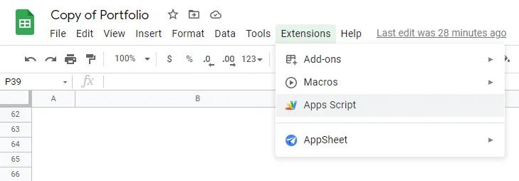 유일하게 스크립트를 사용한 부분입니다. 아래와 같이 [Apps Script]를 클릭해 스크립트 에디터로 진입할 수 있습니다. 앞서 스프레드시트를 복사하며 스크립트까지 함께 복사되어 있을 것입니다.