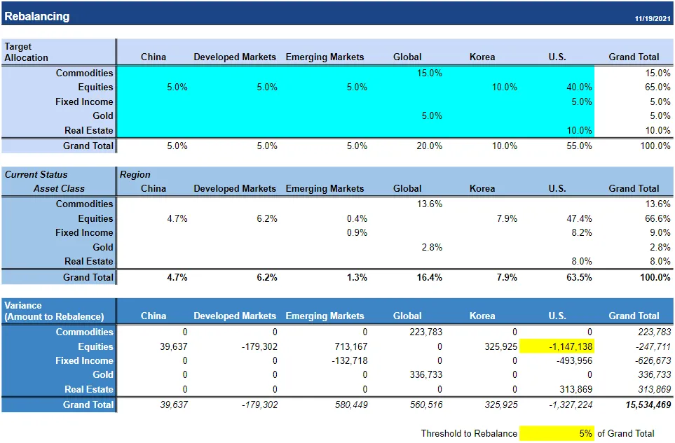 Variance 테이블은 조건서식 기능을 활용해 어떤 자산을 가감해야 할지 노란색으로 알려줍니다. 노란색으로 표시되는 기준은 같은 색으로 칠해진 Threshold 부분에서 조절할 수 있습니다. 위 예시에서는, 총 평가액의 5%를 초과해 자산배분 목표와 벗어난 경우 노란색으로 표시하고 있습니다.