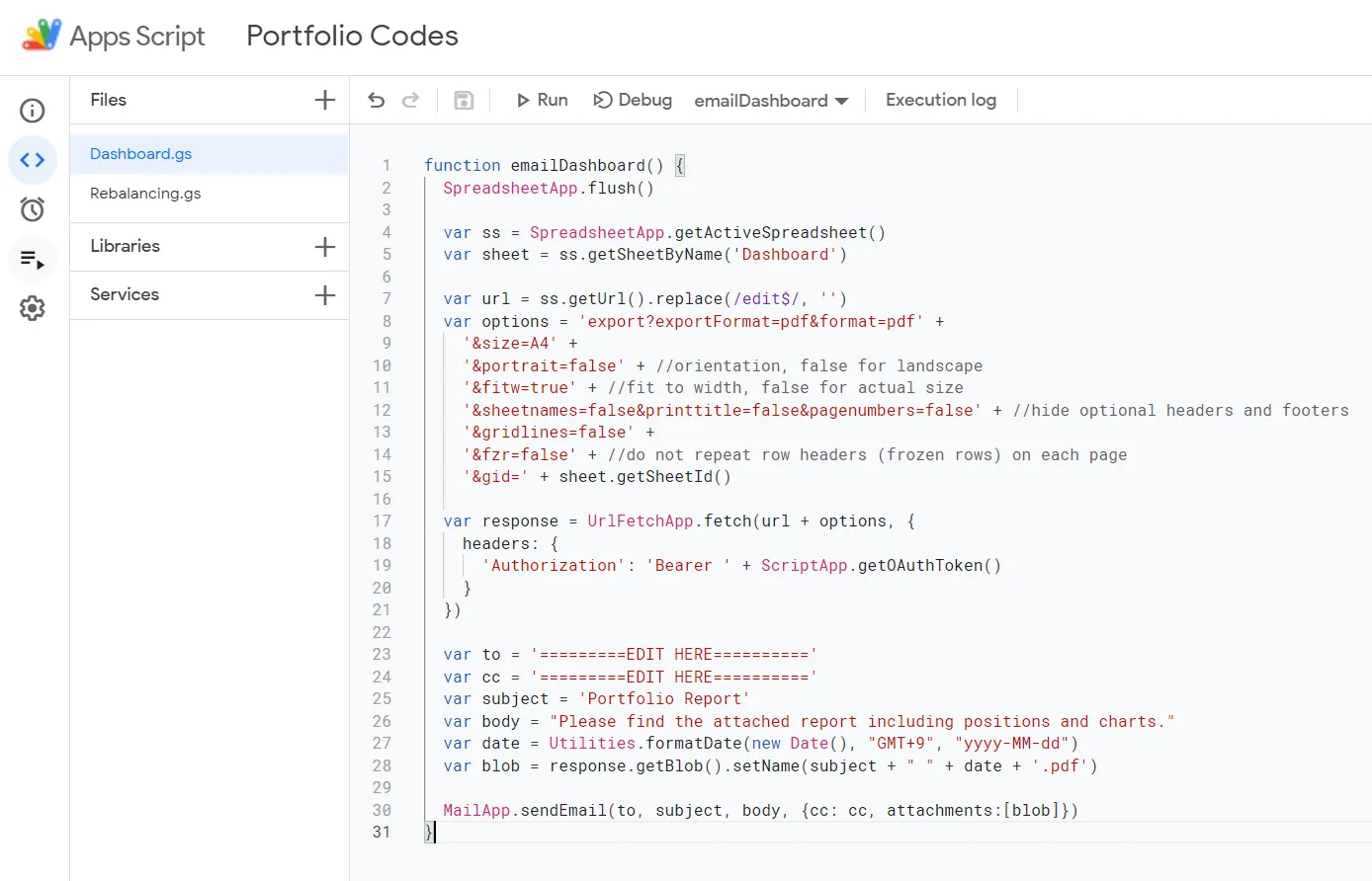 Dashboard 시트와 Rebalancing 시트를 PDF로 만들어 이메일로 발송하는 함수를 각각의 동명 .gs 파일에 정의했고, 23행과 24행의 수신자 이메일 주소(to), 참조자 이메일 주소(cc)를 수정 후 Run을 눌러 테스트해볼 수 있습니다. 이 스프레드시트에서 처음으로 이메일을 발송하기 때문에 권한을 요청하는 다이얼로그가 뜰텐데, 승인하면 됩니다.