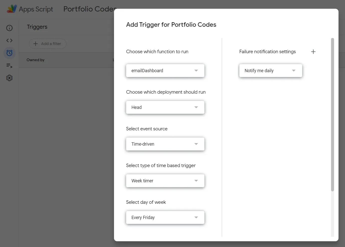 아래와 같이 어떤 함수를 실행할지, 언제 실행할지를 고르고 저장합니다. 본인의 성향에 맞게 이메일 발송빈도를 정하시면 됩니다. 저는 Dashboard 시트는 주 1회, Rebalancing 시트는 매월초 받아보는 것으로 2개의 Trigger를 추가했습니다.