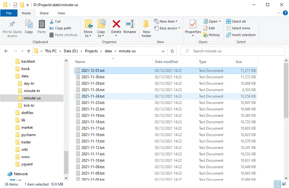 국내시장 주가정보는 100% 자동으로 취득하게끔 해놓은 반면, 미국시장은 아쉽게도 위와 같이 압축파일을 직접 받아와야 하는 수고로움이 있습니다. 그러나, 구글/야후 파이낸스 등을 통해 일자별 OHLCV 정도에 만족해야 했던 것에 비해 앞으로는 더욱 해상도 높은 데이터를 취득할 수 있게 되어 백테스트에 큰 도움이 될 것으로 기대됩니다.